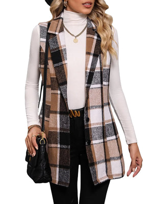 MakeMeChic Womens Plaid Vest Coat Casual Lapel Neck Button Front Sleeveless Blazer Jacket Outerwear Coffee Brown S