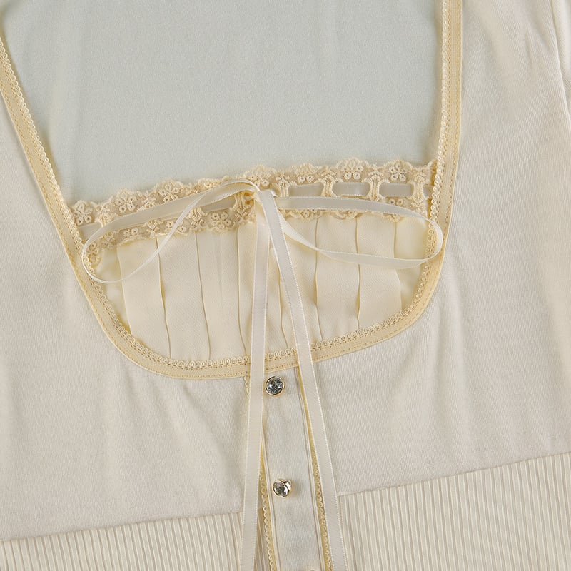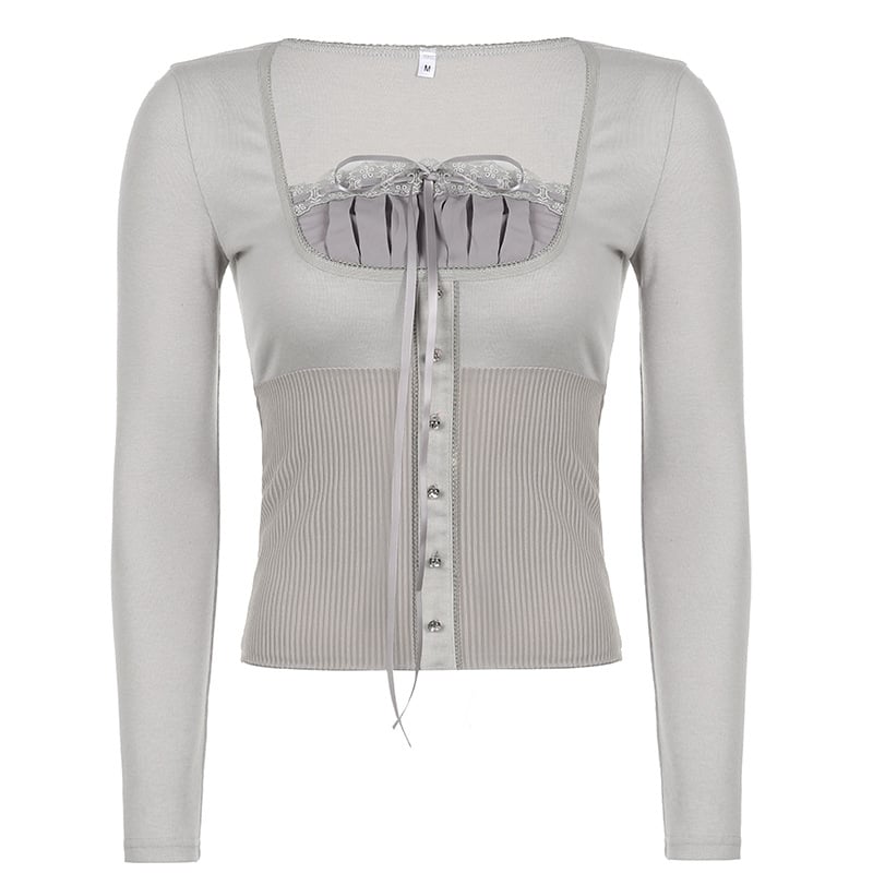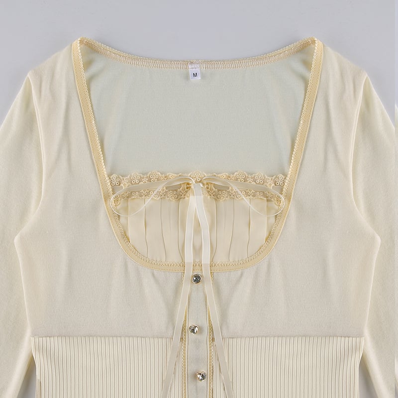 The square collar adds a unique twist, while the delicate lace edge ribbon brings a subtle femininity that enhances your style. Whether you're dressing up for a special occasion or looking for a casual outfit, this t-shirt is versatile enough to be paired with your favorite jeans or a chic skirt.