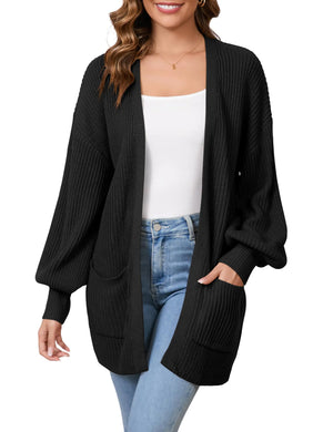 SPR&JOY Women’s Lantern Sleeve Cardigan Sweaters Drop Shoulder Open Front Knit Tops Solid Loose Outwear Coats with Pockets Black